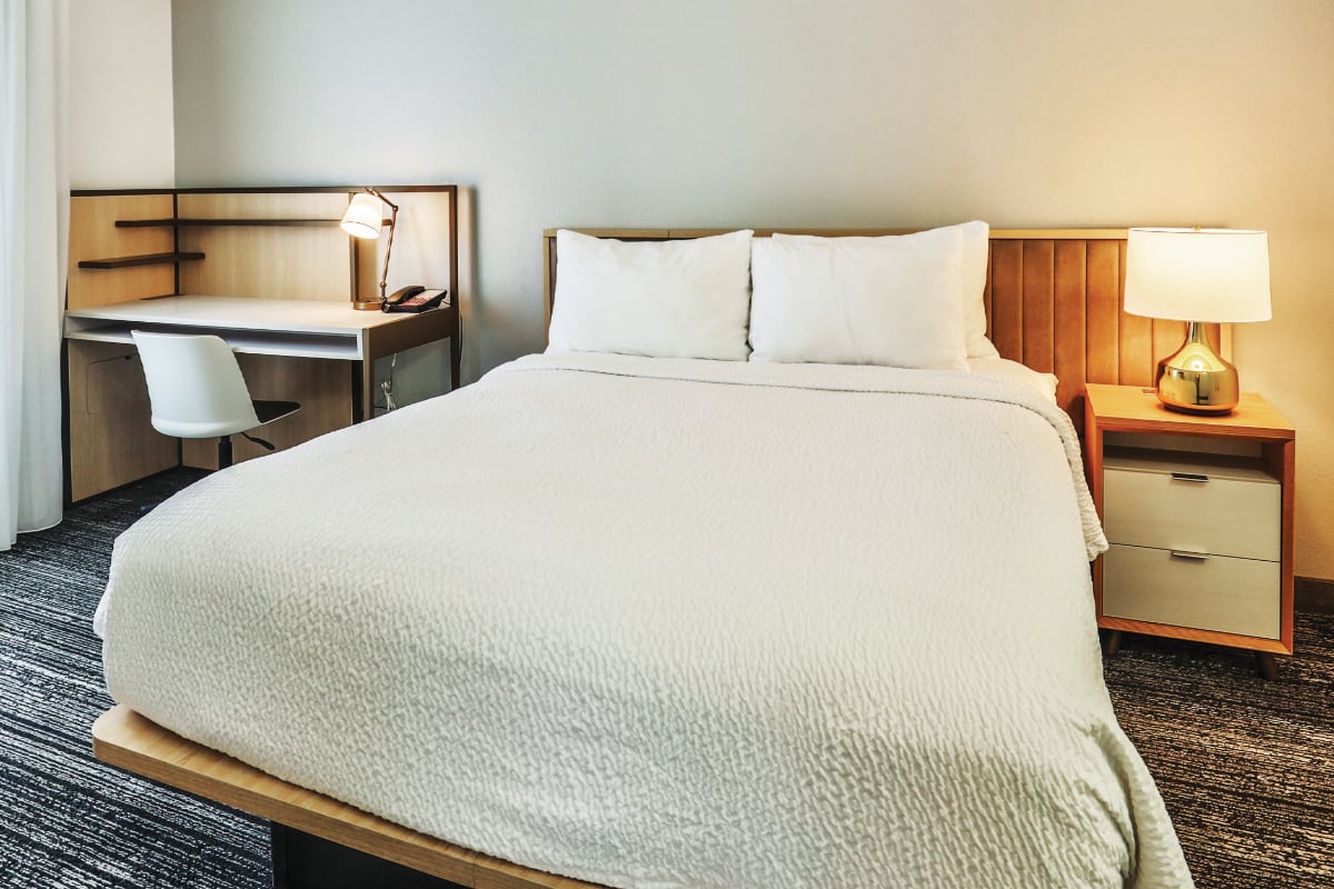 All rooms feature complete kitchens with a full-sized refrigerator, microwave, oven, stove, and dishwasher. The hotel website lauds luxurious bedding with crisp linens, thick mattresses, custom comforters, and fluffy pillows.
