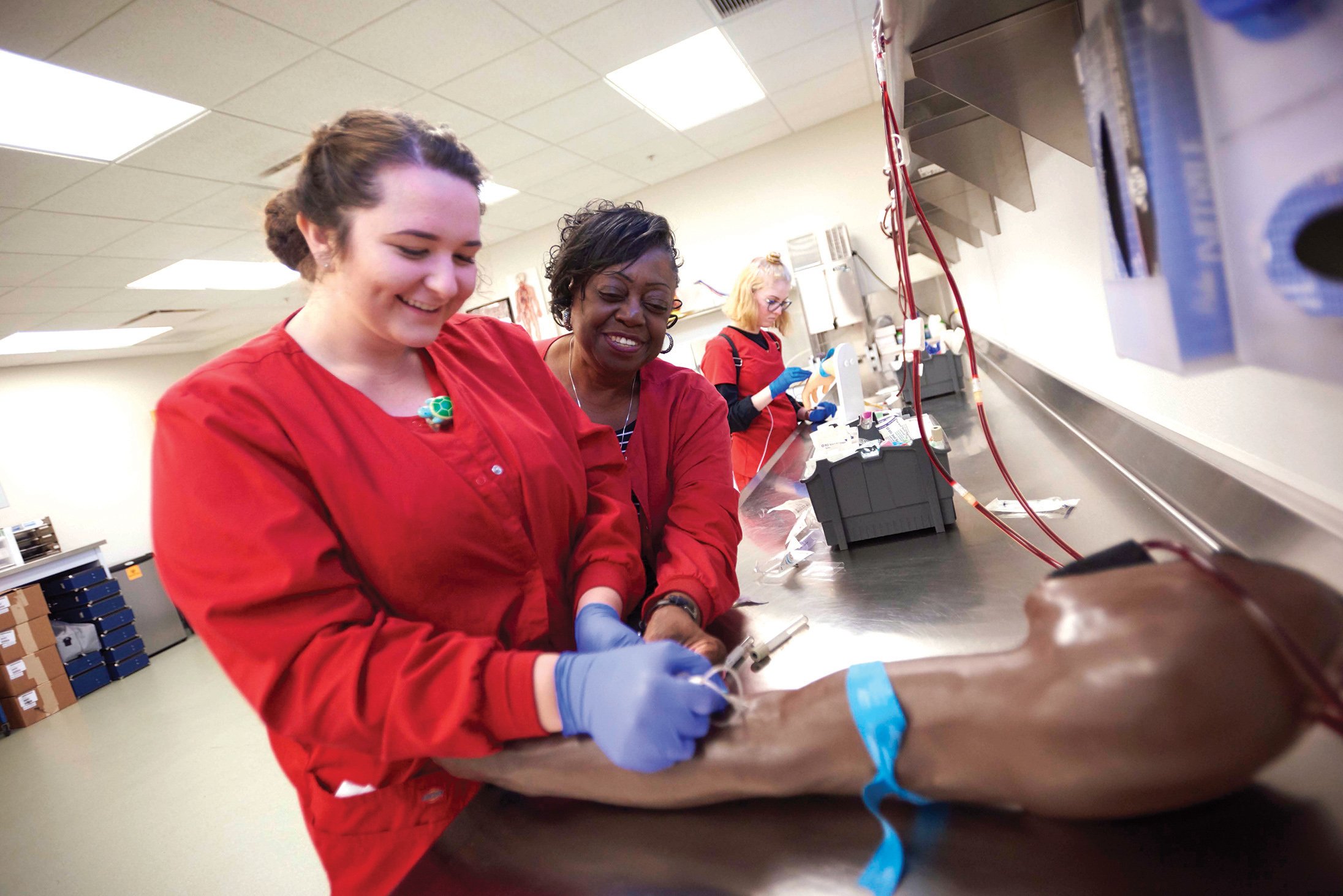 helps a Phlebotomy Technology Program student draw blood from a simulator. Photo Courtesy of Pensacola State College